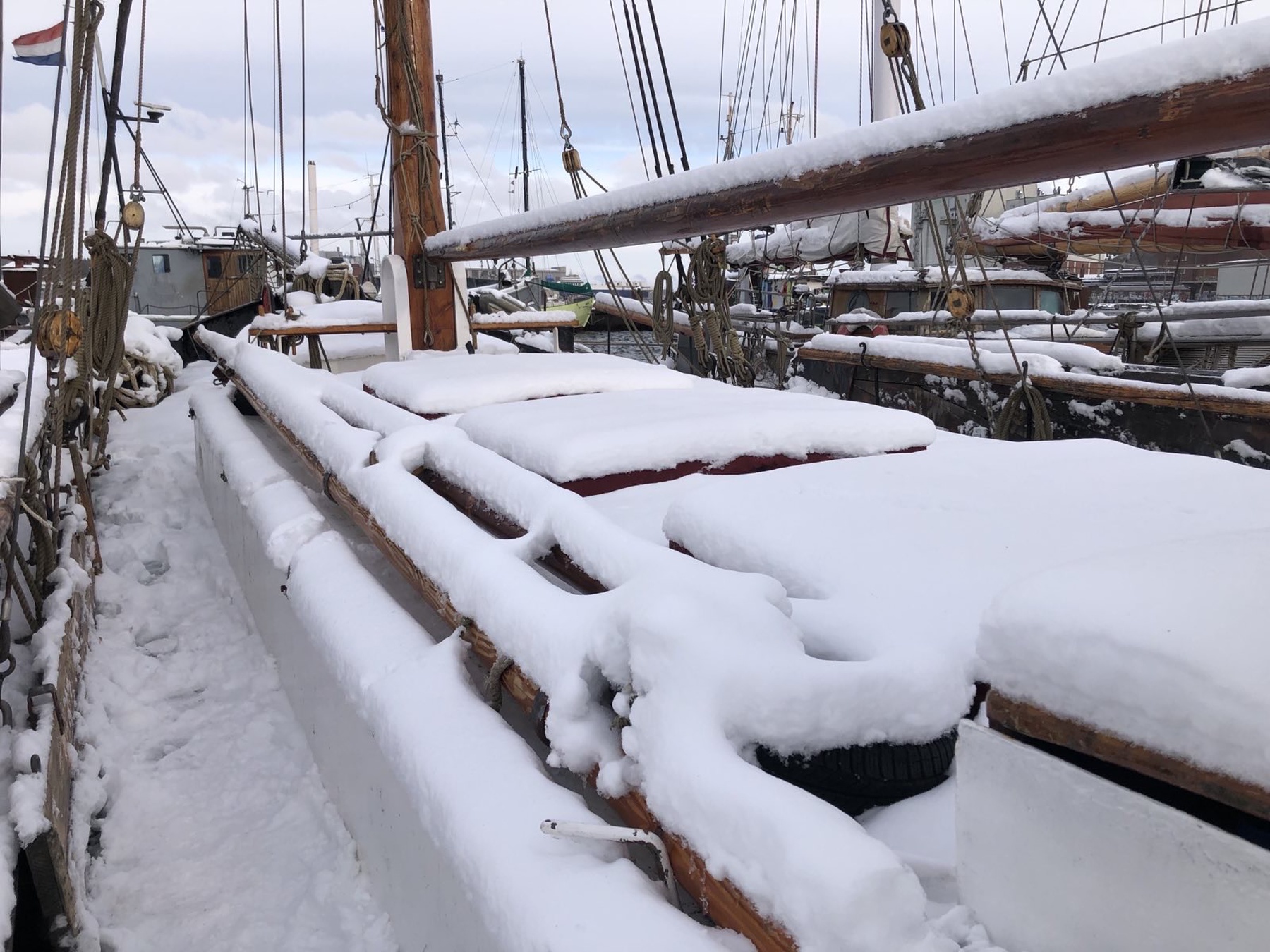 Unserem Schaffensdrang hat erst einmal der Winter ein Beinchen gestellt. Das Deck ist verschneit, unser Beiboot "Jackpot" steckt im Eis.